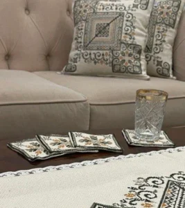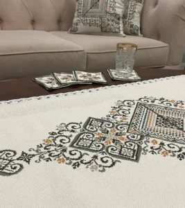 ✔ Table Runner – A statement piece with detailed mocha brown tatreez embroidery. ✔ Throw Pillow Covers (Set of 2) – Matching pillow covers for a cozy, coordinated look. ✔ Fabric Embroidered Coasters (Set of 4) – Stylish and practical for protecting your surfaces.