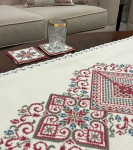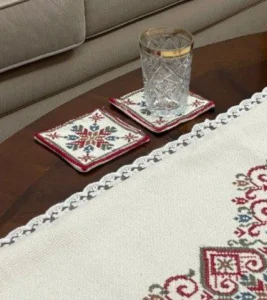 ✔ Table Runner – A statement piece with detailed red and turquoise tatreez embroidery. ✔ Throw Pillow Covers (Set of 2) – Matching pillow covers for a cozy, coordinated look. ✔ Fabric Embroidered Coasters (Set of 4) – Stylish and practical for protecting your surfaces.